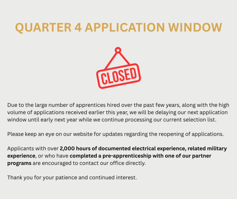 Please note, we are no longer a part of the IBEW's Phone tree; you will have to call this number to get a hold of the JATC Office.